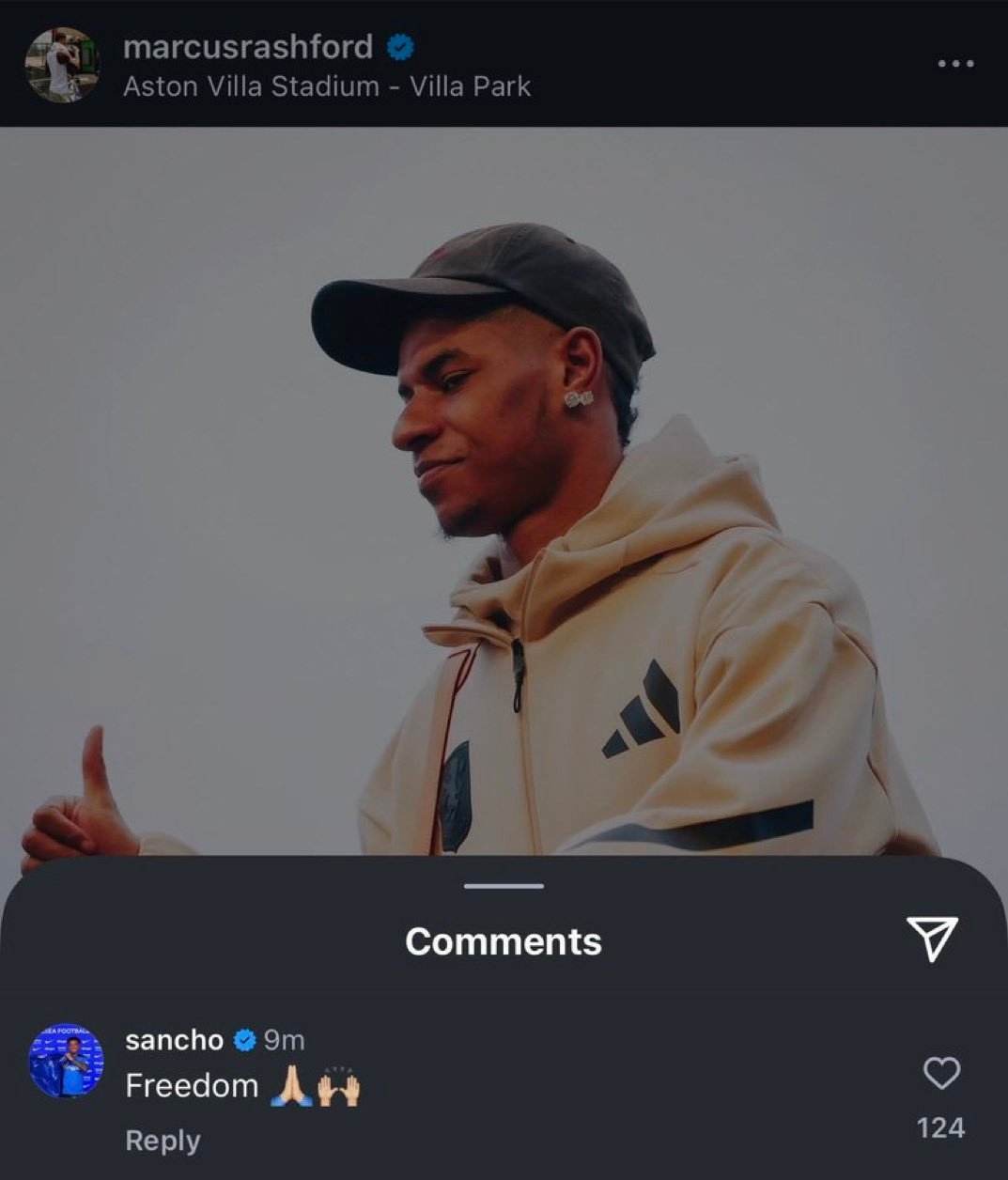 拉什福德冬窗租借離開(kāi)曼聯(lián),而此前夏窗就已離隊(duì)的桑喬則在拉什福德社媒下回復(fù)稱其獲得“自由”。
