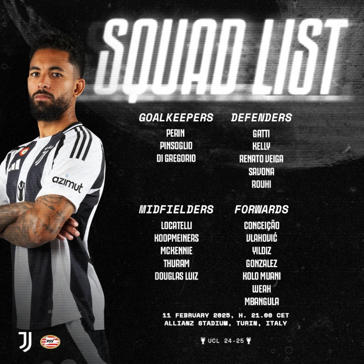2月11日訊 北京時間明天凌晨4點,尤文將在歐冠淘汰賽附加賽首回合比賽中主場對陣埃因霍溫,尤文公布了此役的球員名單,弗拉霍維奇、穆阿尼、凱利在列,阿爾貝托-科斯塔落選。