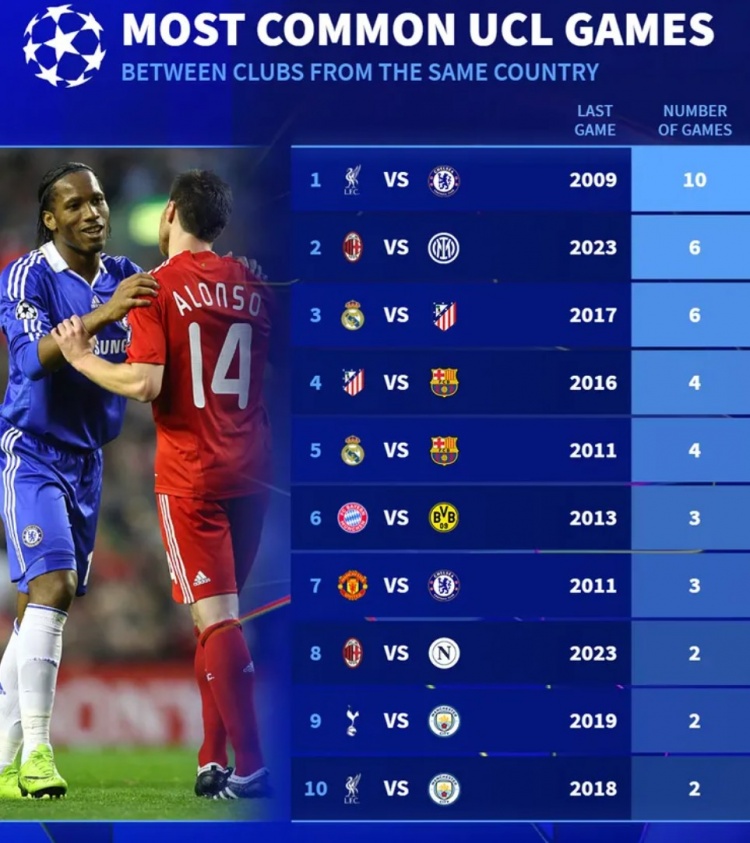 德轉(zhuǎn)列歐冠同國德比次數(shù)榜及上次交手時(shí)間: