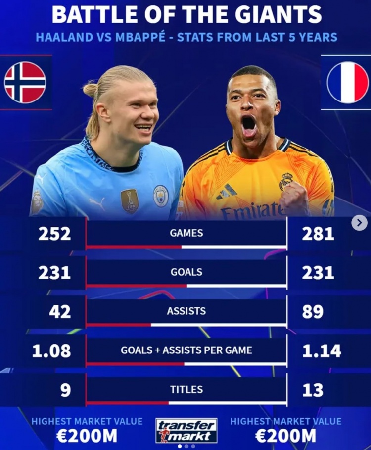 2月12日訊 皇馬和曼城即將迎來歐冠淘汰賽附加賽,《轉會市場》也列出了姆巴佩和哈蘭德近5年的關鍵數(shù)據(jù)對比:
