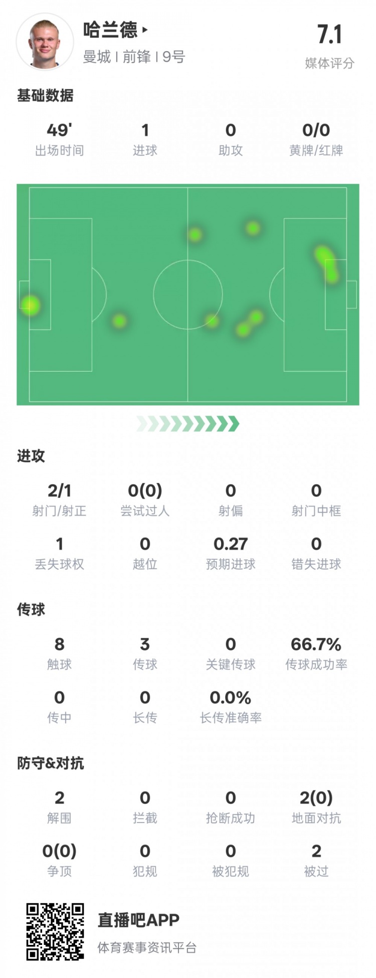 哈蘭德半場(chǎng)數(shù)據(jù)如下: