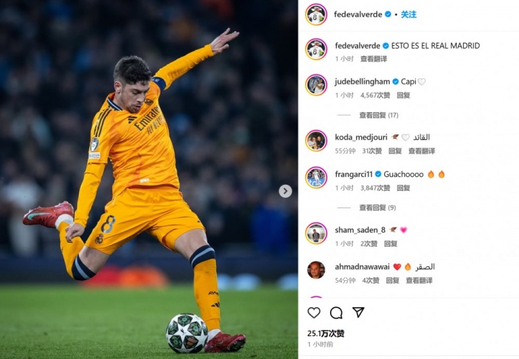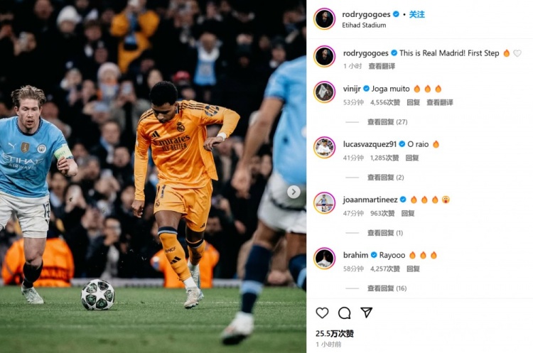 本場(chǎng)客串右后衛(wèi)的巴爾韋德表示:“這就是真正的皇馬!”而右邊鋒羅德里戈也配文道:“這就是皇馬!邁出(晉級(jí))第一步????????”