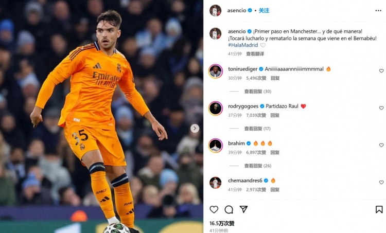 呂迪格評論區(qū)送鼓勵!勞爾-阿森西奧社媒:在曼城邁出晉級第一步