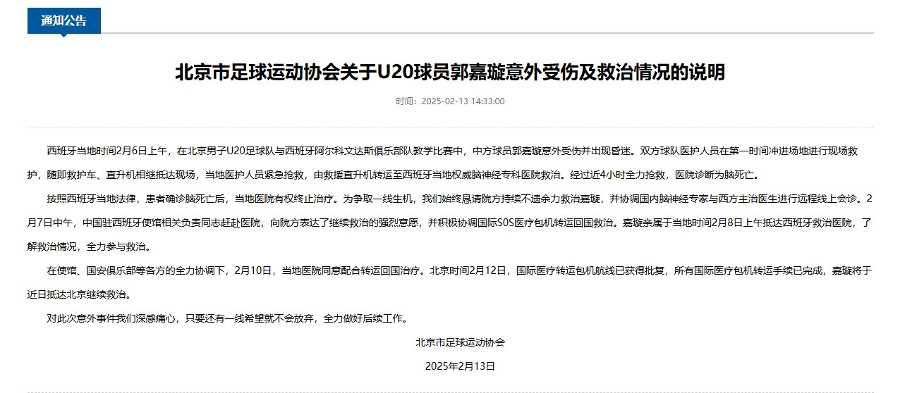 北京市足球運(yùn)動(dòng)協(xié)會(huì)關(guān)于U20球員郭嘉璇意外受傷及救治情況的說(shuō)明