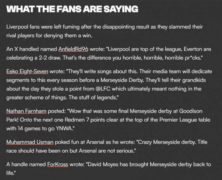 2月13日訊 英超第15輪補(bǔ)賽,利物浦客場(chǎng)2-2遭埃弗頓絕平,比賽爭(zhēng)議場(chǎng)面不斷,賽后雙方還爆發(fā)了沖突。國外一些紅軍球迷對(duì)這場(chǎng)比賽表達(dá)了看法。