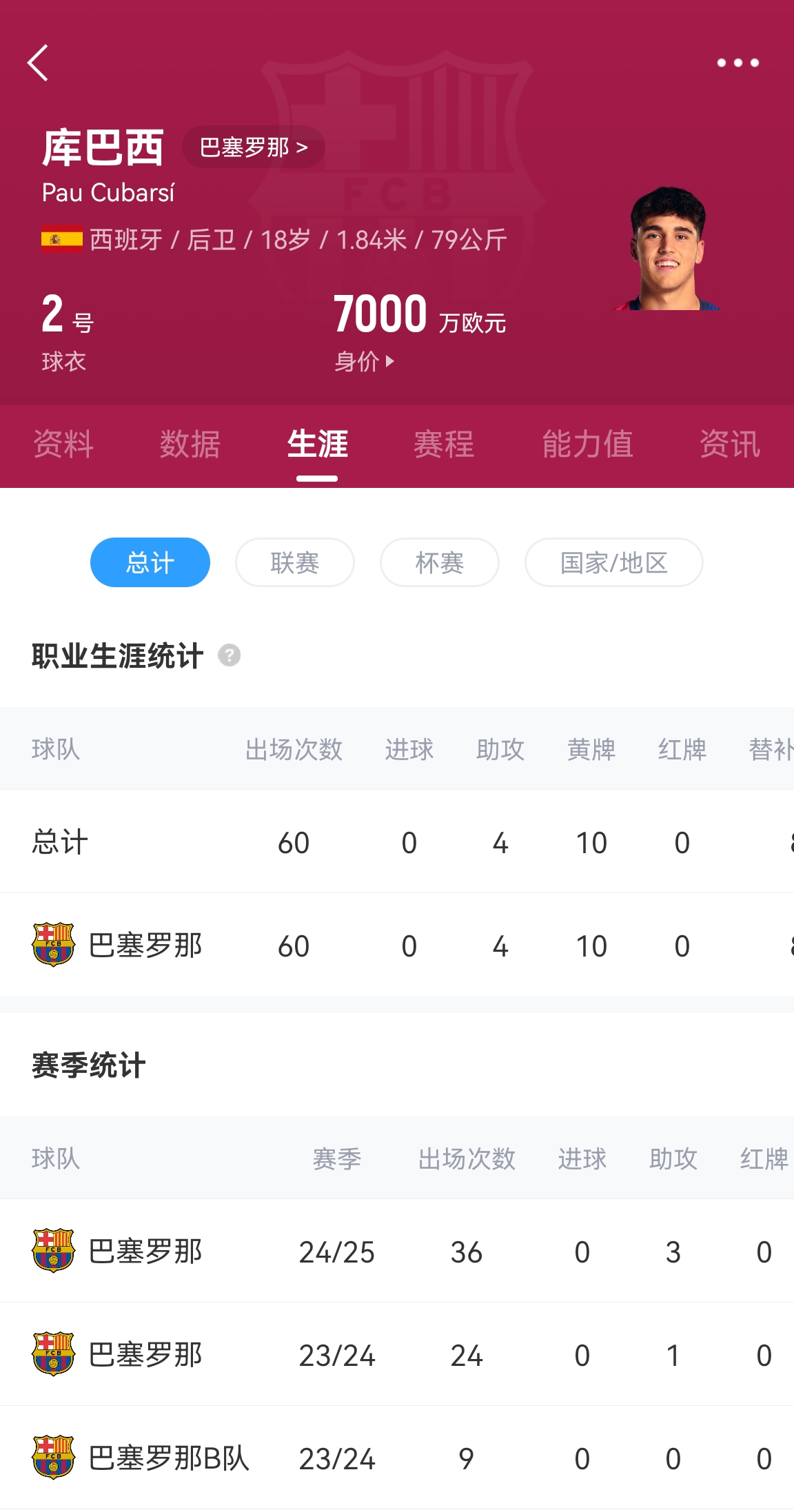 庫巴西是拉瑪西亞出品,在這個年紀(jì)已經(jīng)為巴薩成年隊出場了60次,他的身價已經(jīng)達到了7000萬歐元。