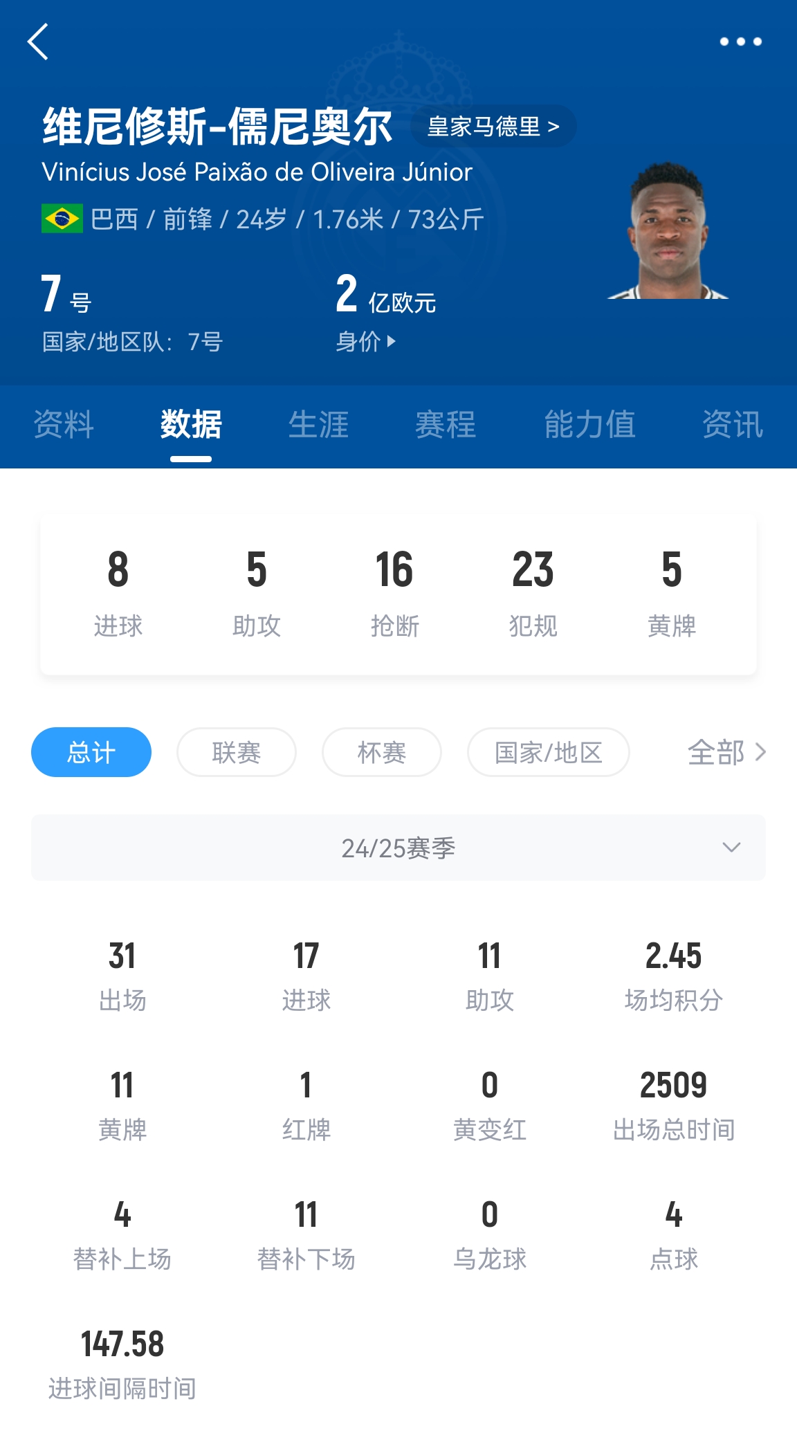 2月12日,維尼修斯在逆轉(zhuǎn)曼城賽后采訪稱不知道沙特報價,希望留在皇馬很長時間。