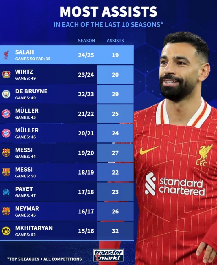 2月14日訊 薩拉赫在本賽季以19次助攻領(lǐng)跑五大聯(lián)賽各項(xiàng)賽事總助攻榜,《轉(zhuǎn)會(huì)市場(chǎng)》也列出了近10賽季的總助攻王情況。