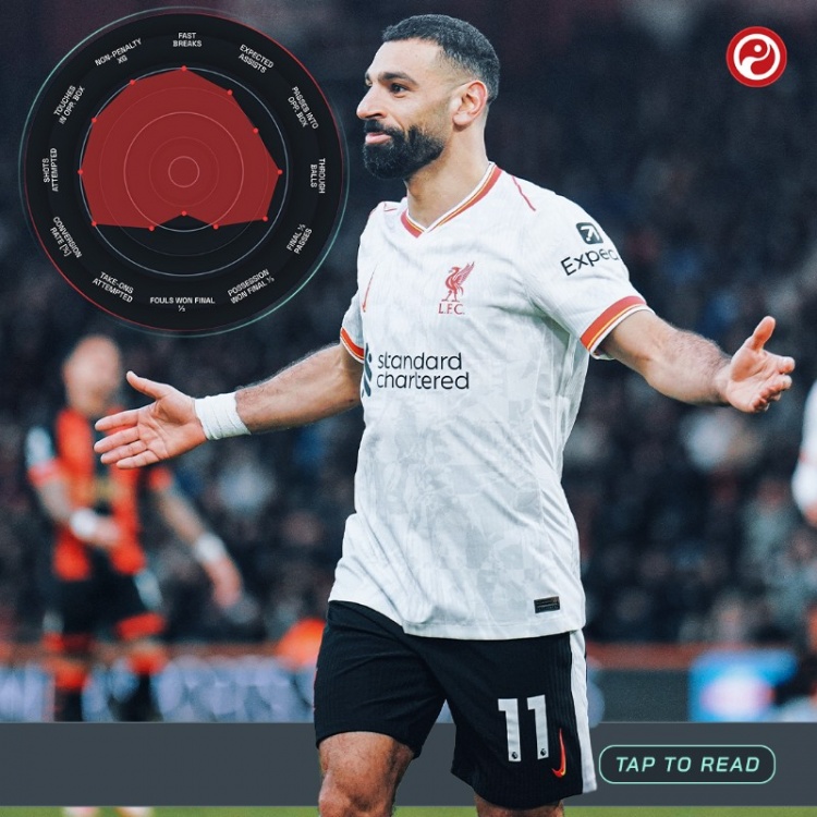 數(shù)據(jù)統(tǒng)計顯示,這位32歲的埃及邊鋒本賽季英超24場全勤,貢獻(xiàn)22球14助攻,每59分鐘直接參與1球。