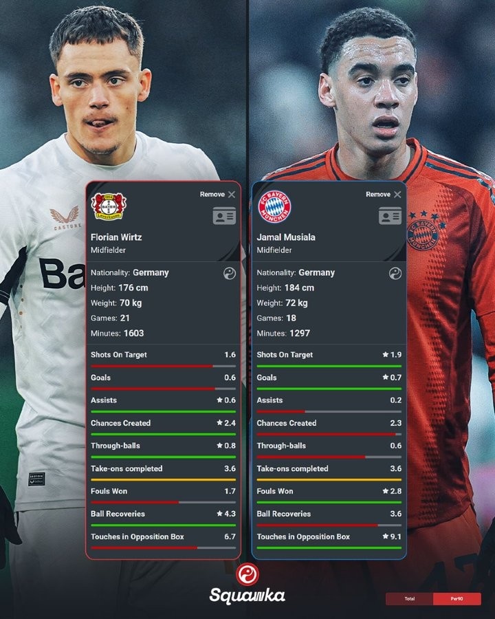 2月15日訊 勒沃庫森將在本輪德甲焦點戰(zhàn)迎戰(zhàn)拜仁,兩位德國帝星將正面對決。squawka也對比了兩人本賽季德甲關(guān)鍵數(shù)據(jù)情況。