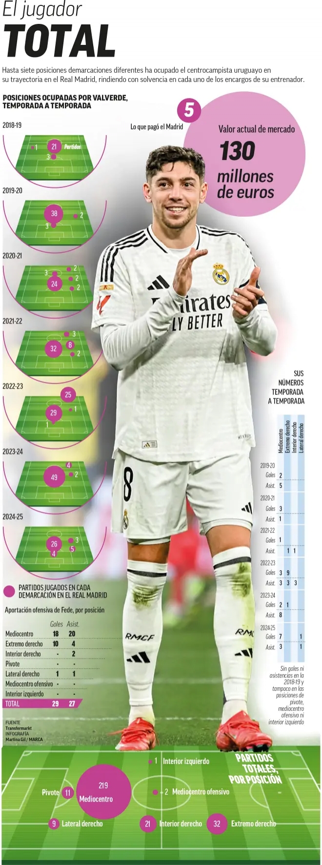 巴爾韋德的主業(yè)則是中場,500萬歐轉會費買下的他,如今身價1.3億歐。而實際上,身兼多職的他毫無疑問是無價的:邊中場,居中,前腰,后腰……師從克羅斯的巴爾韋德,總共擔任過7個不同的位置。