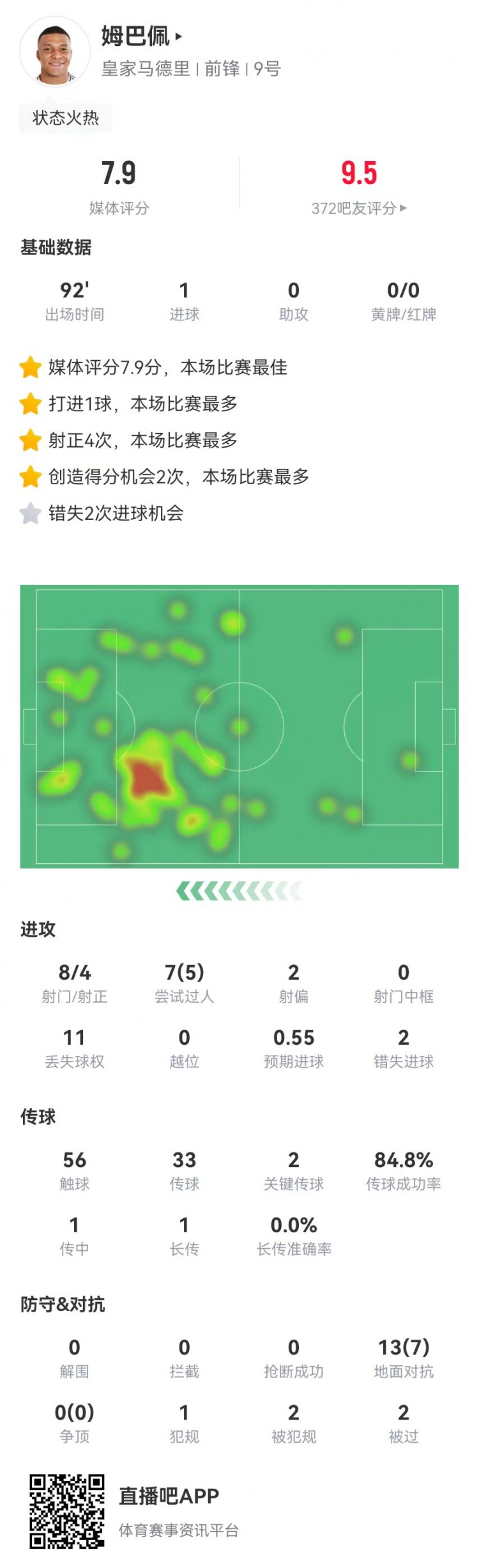 姆巴佩本場8射4正進(jìn)1球+2失良機(jī) 2造良機(jī)+7過人5成功 7.9分最高
