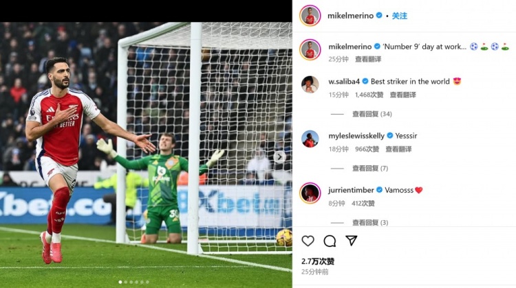 梅里諾首次客串中鋒便打進(jìn)2球,他也通過社媒曬出自己進(jìn)球后的慶祝照,并配文:“9號位上班日… ????????