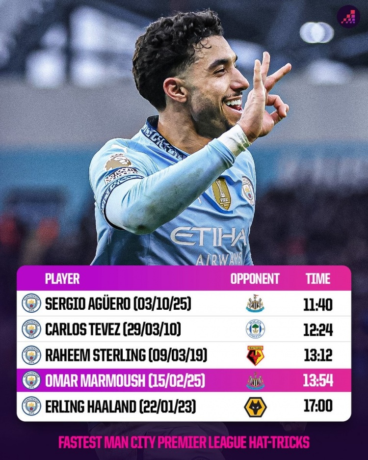 2月16日訊 曼城在本輪英超3-0領先紐卡,馬爾穆什上半場戴帽,數據統(tǒng)計顯示他3粒進球間隔僅13分54秒。