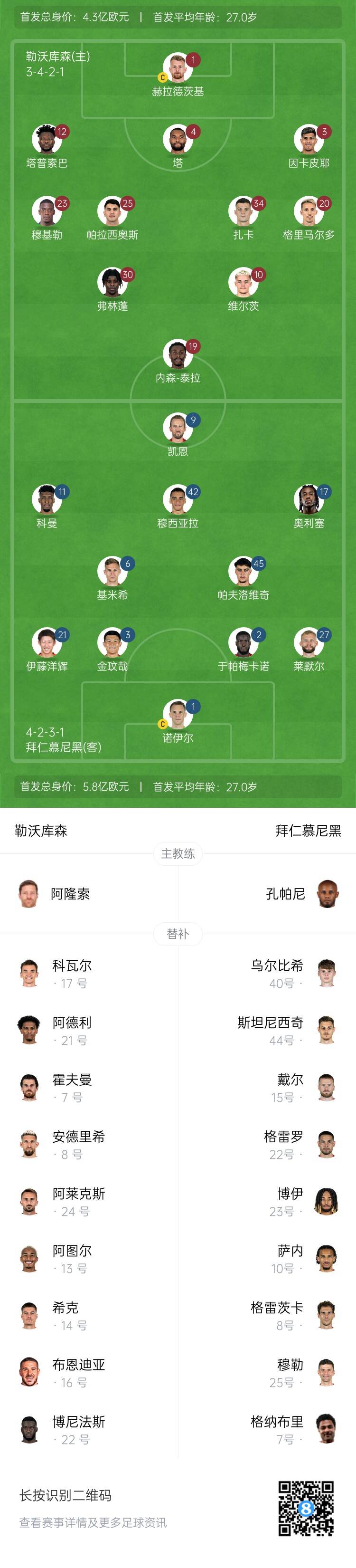 勒沃庫森首發(fā):1-赫拉德茨基、3-因卡皮耶、4-若納坦-塔、12-塔普索巴、23-穆基勒、20-格里馬爾多、34-扎卡、25-帕拉西奧斯、30-弗林蓬、10-維爾茨、19-內(nèi)森-泰拉