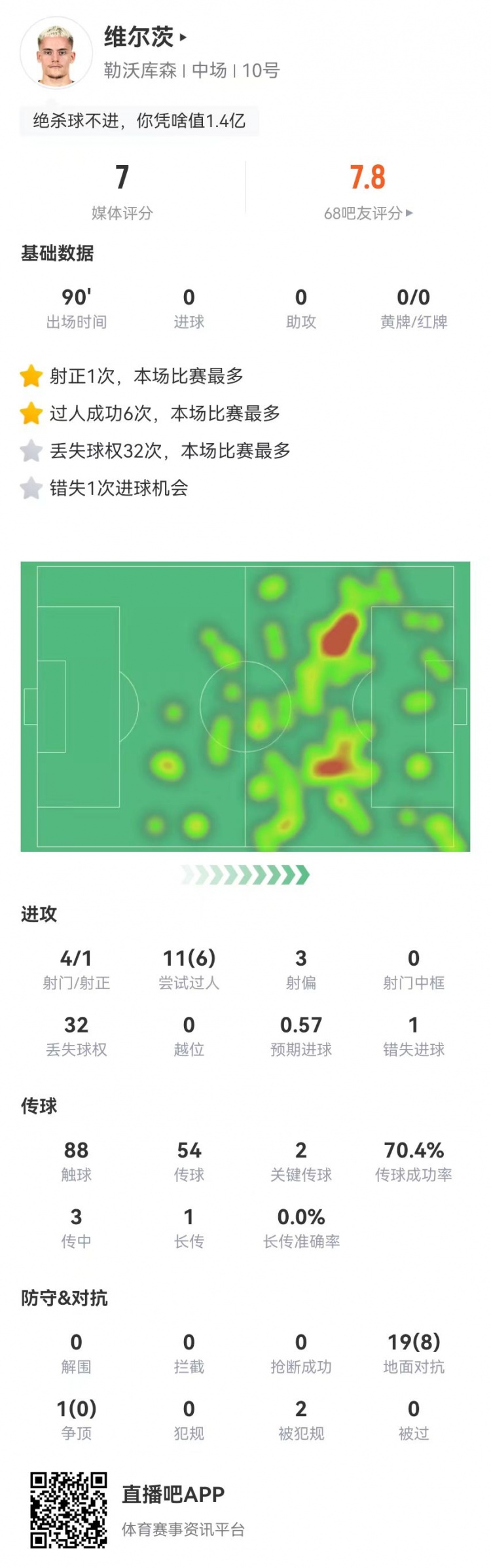 2月16日訊 勒沃庫森在本輪德甲0-0遭拜仁逼平,維爾茨本場數(shù)據(jù)如下: