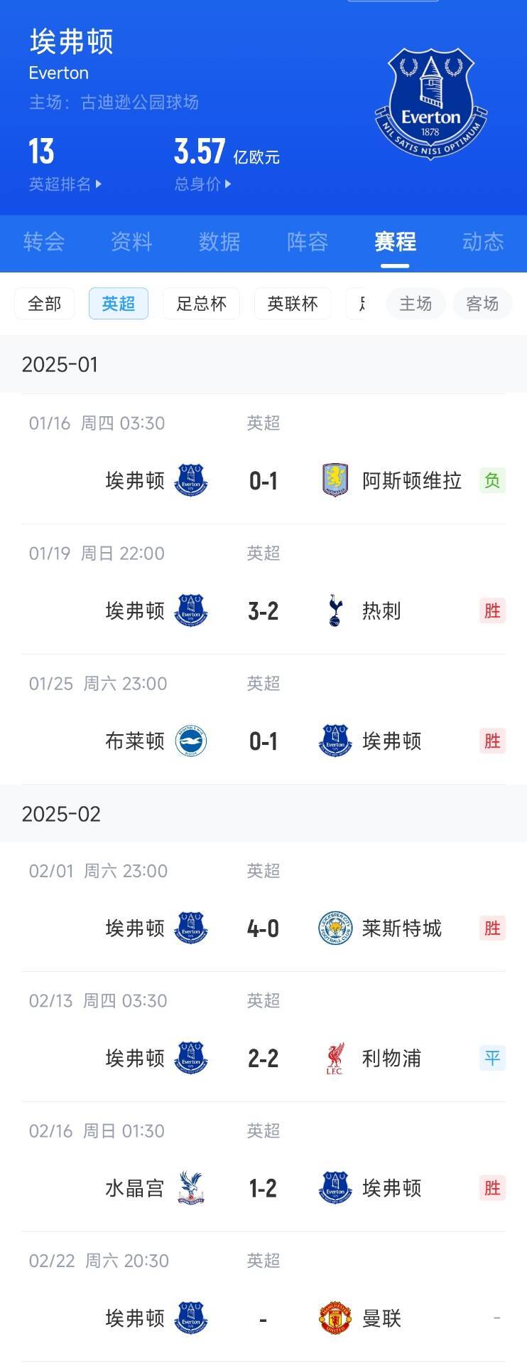 02月16日訊 英超第25輪,埃弗頓2-1客勝水晶宮,近5輪4勝1平狂攬13分。莫耶斯上任之后6場(chǎng)英超比賽,只在首秀0-1輸了維拉。