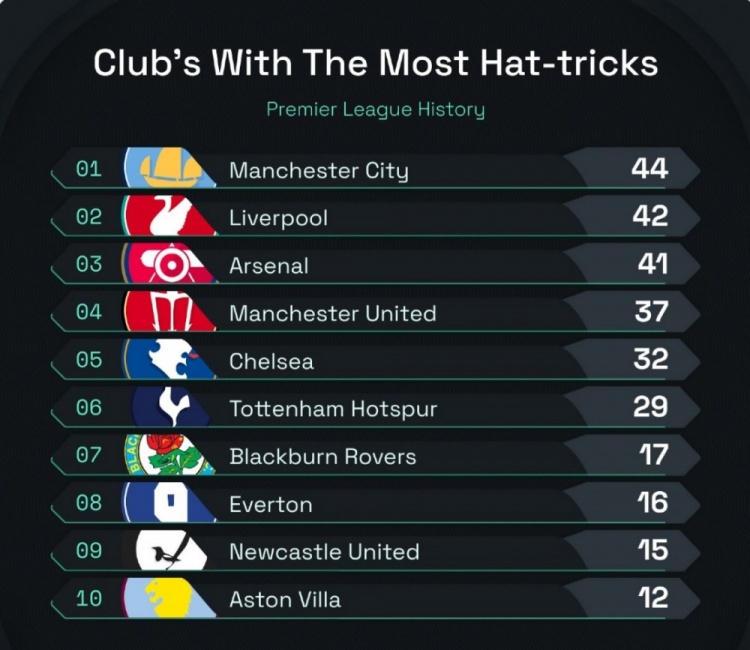 英超歷史各隊(duì)球員戴帽次數(shù)榜:曼城44次居首,利物浦42次第二