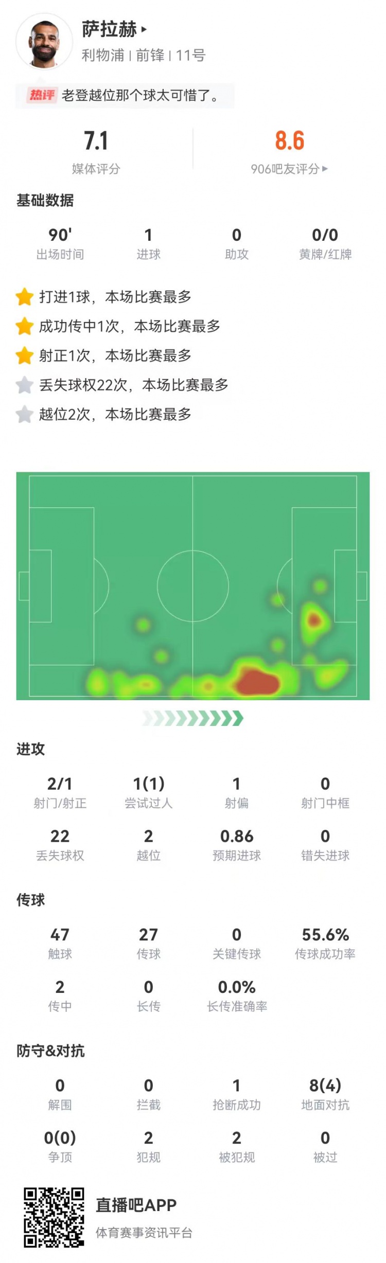 薩拉赫本場1球+8對抗4成功 2犯規(guī)2造犯規(guī)2越位 獲評7.1分